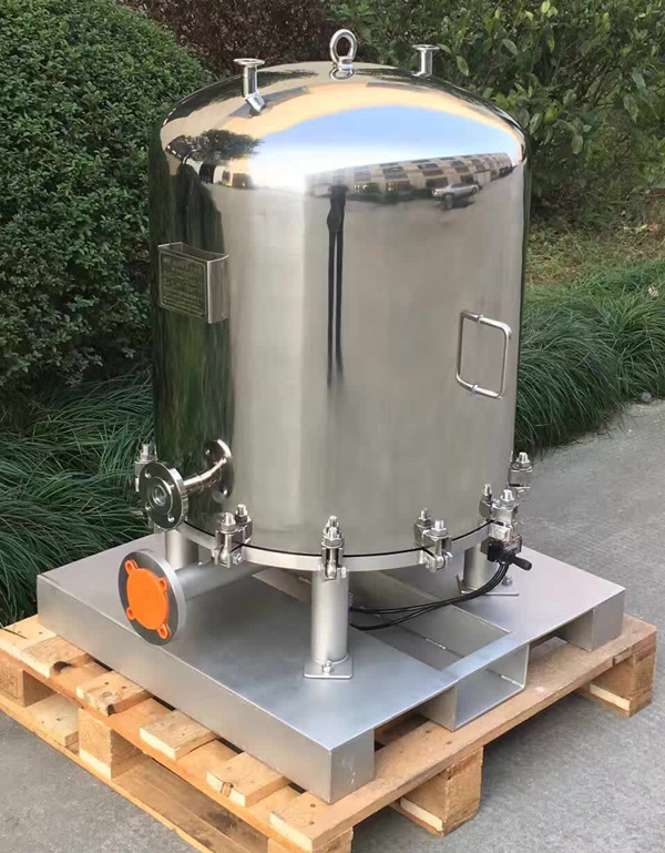 該過濾機是在密閉的筒體內,由若干片水平放置的濾板中間裝夾濾紙組成。它是依靠濾紙作過濾介質,在密閉容器內進行加壓過濾。過濾時,濾液由輸送泵送入過濾體內,沿著濾板外圈周上的小孔進入兩層濾板間,濾液穿過濾紙和多孔支撐板,流入濾板中心孔道,在機體底部出料口流出,過濾精度較高。過濾完后,用壓縮空氣將過濾機內殘液.